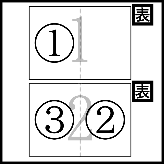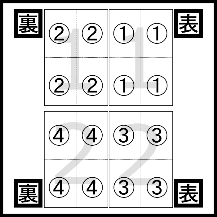 PDF紙面1ページに対して誌面2ページを割り付ける出力形式であり、両面合わせて4ページを割り付けますが、中綴じと異なり、用紙一枚一枚を折って重ねる形式となります。(まとめて折らない)